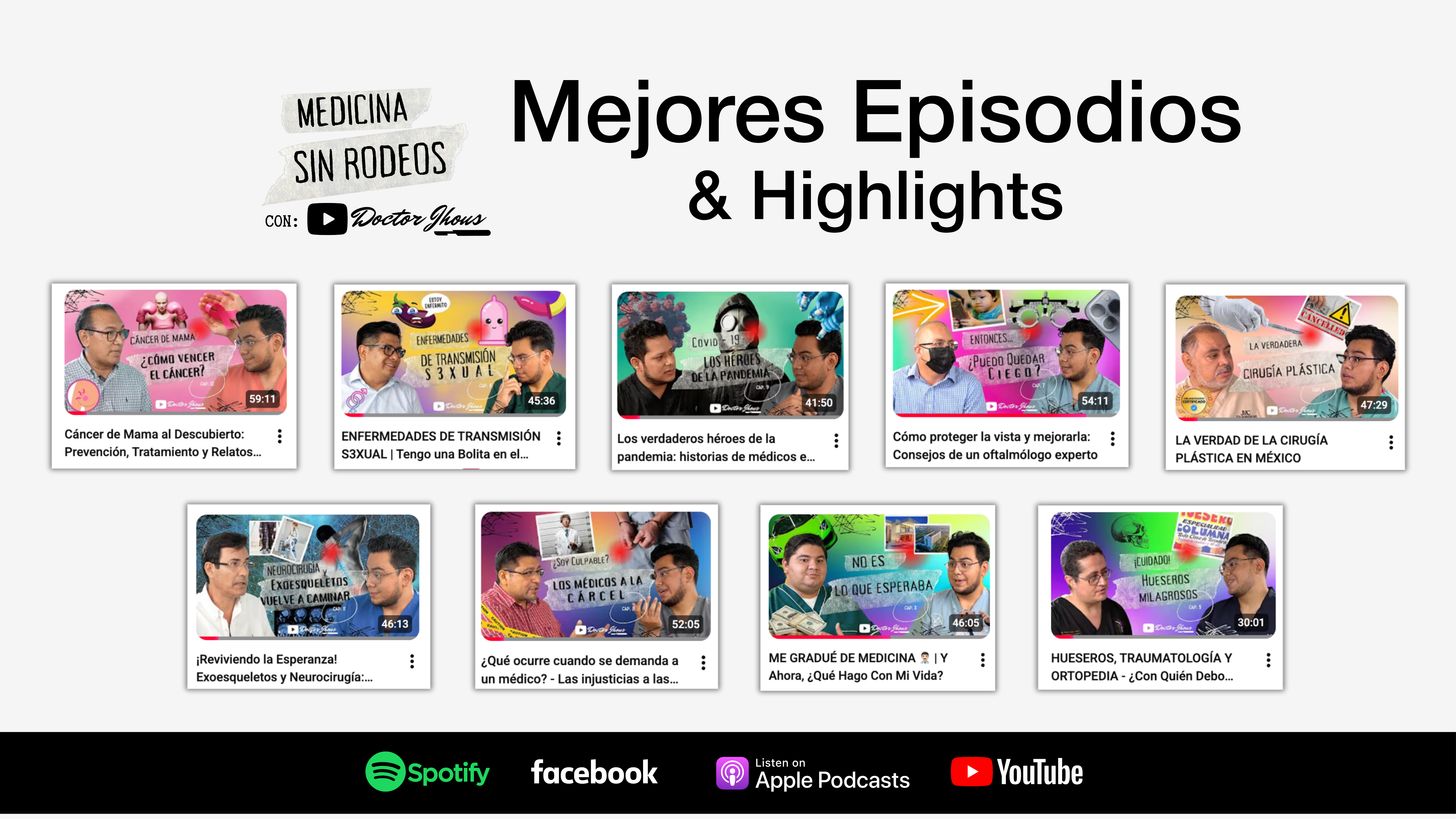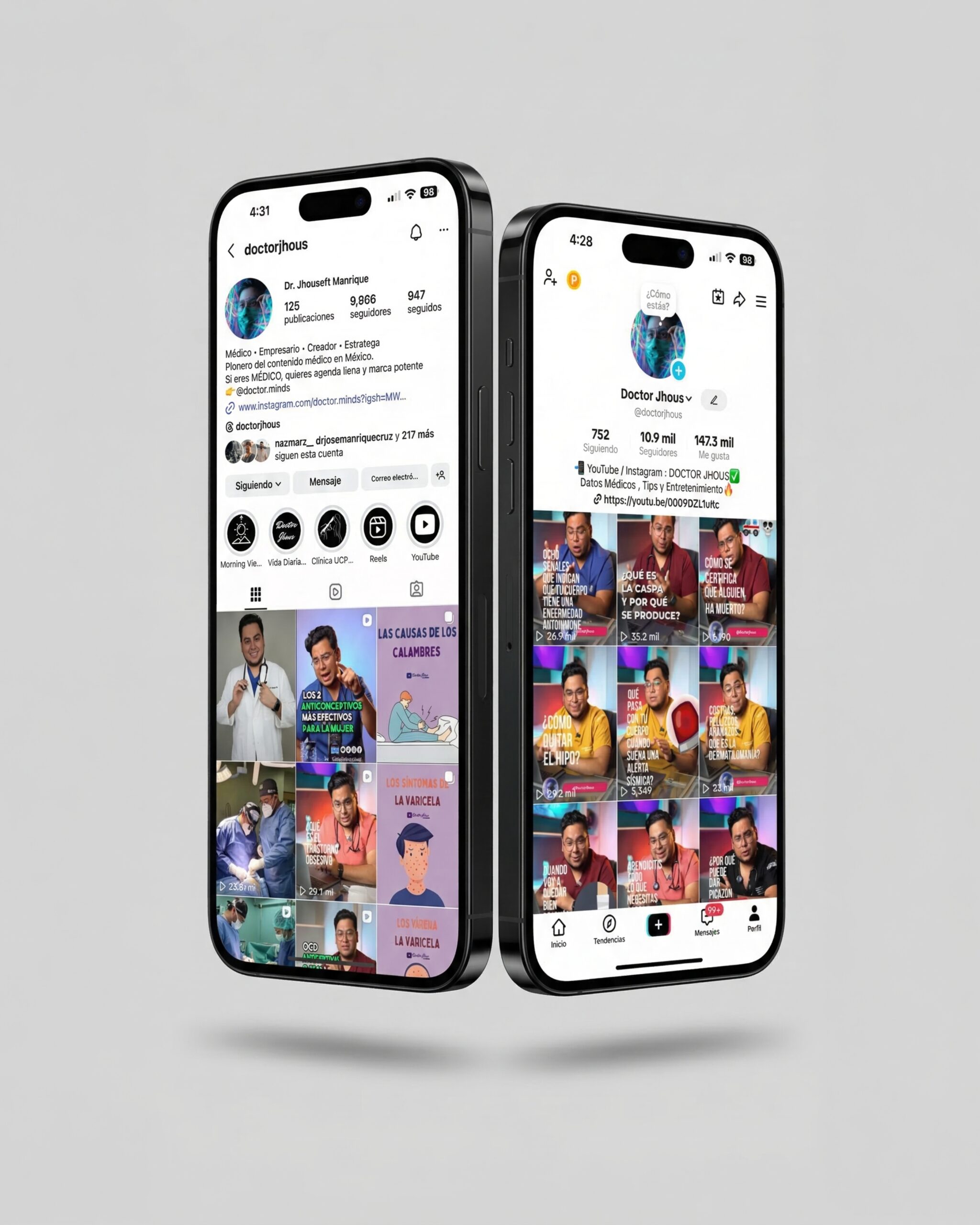 Bajo la marca Doctor Jhous, desarrollamos un ecosistema digital robusto en YouTube, Facebook, Instagram y TikTok, enfocado en responder las dudas que la gente realmente busca en internet. El corazón del proyecto fue la creación del podcast “Medicina sin rodeos”, un espacio donde el Dr. Jhouseff entrevistó a especialistas de talla internacional, otorgándoles el reconocimiento que merecen y acercando temas de salud de alto interés público a la sociedad. El objetivo siempre fue claro: educar sin rodeos, humanizar la figura del médico en formación y establecer una base sólida de confianza antes de que el doctor abriera siquiera su primer consultorio privado.